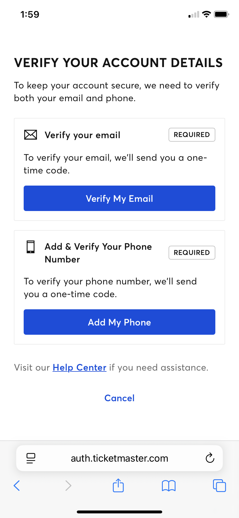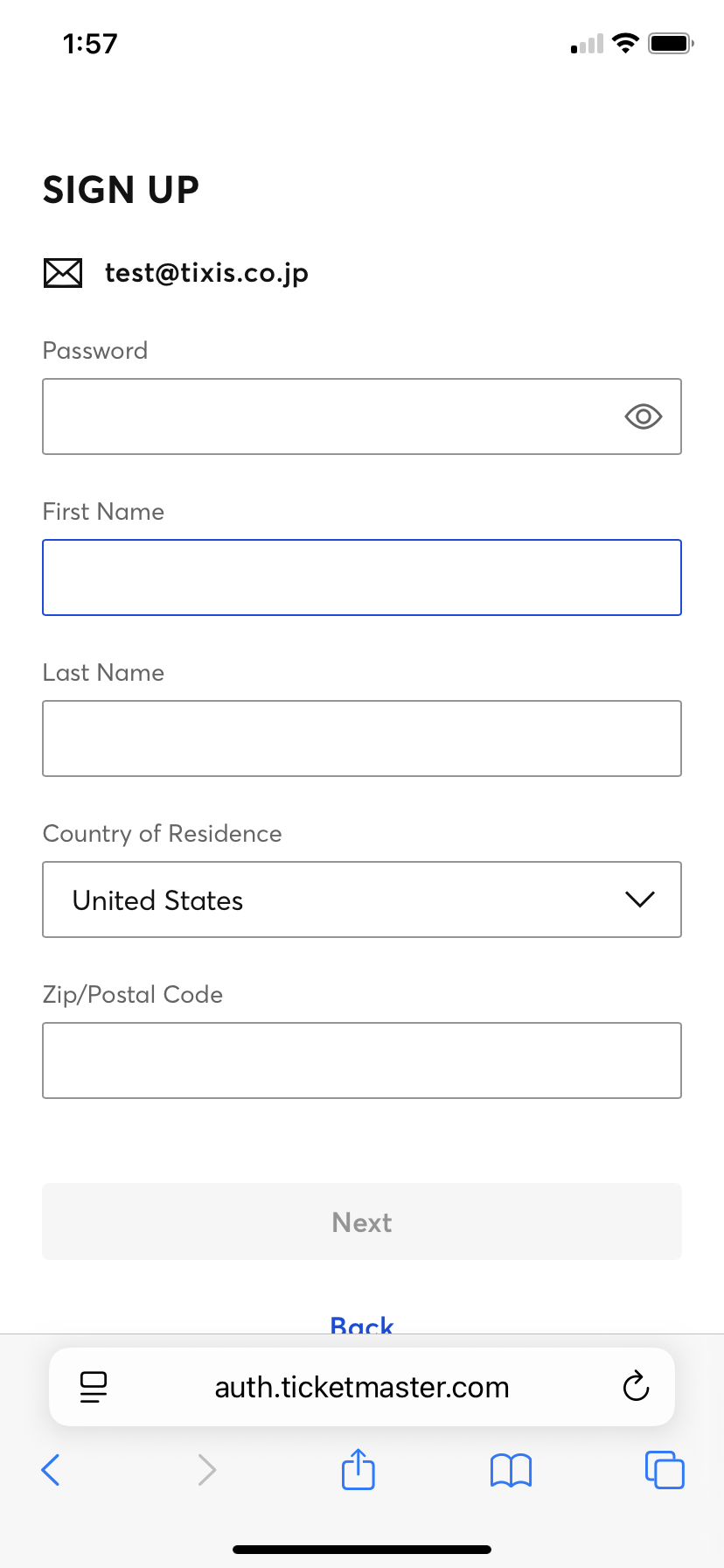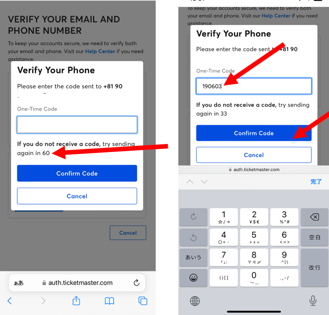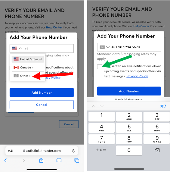 電話番号を入力し、 「Add Number」をタップすると、チケットマスターからショートメールで認証コードが届きます。