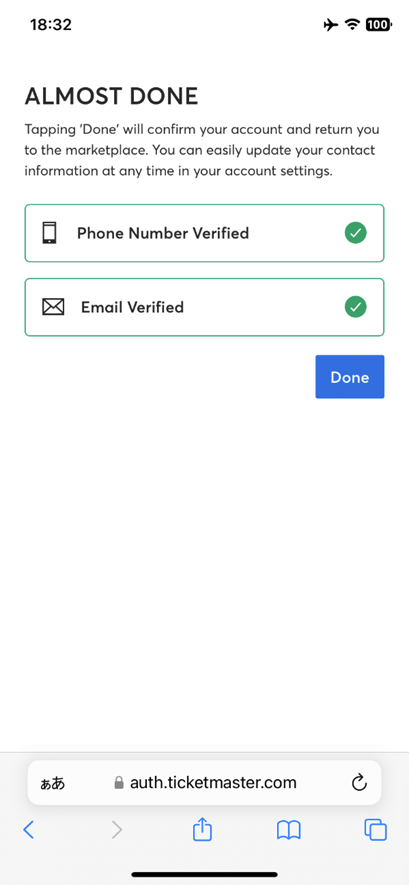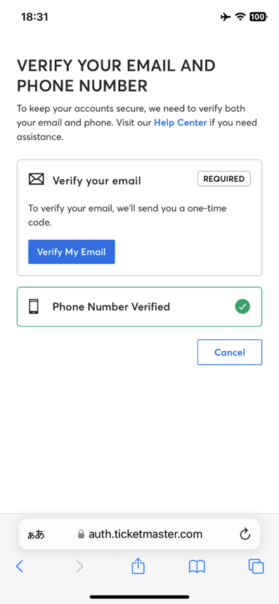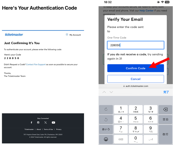 電話番号とEメールアドレスを登録するとチケットマスターから認証コードが電話の場合は、ショートメール、Eメールアドレスの登録の場合は、Eメールで送られてきます。
